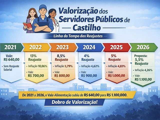 Desde o início da atual gestão, em 2021, os servidores públicos municipais de Castilho vêm recebendo reajustes salariais anuais, sempre com base na inflação do ano anterior. A única exceção ocorreu em 2021, quando a legislação federal vedava aumentos salariais para o funcionalismo em virtude da pandemia de Covid-19.